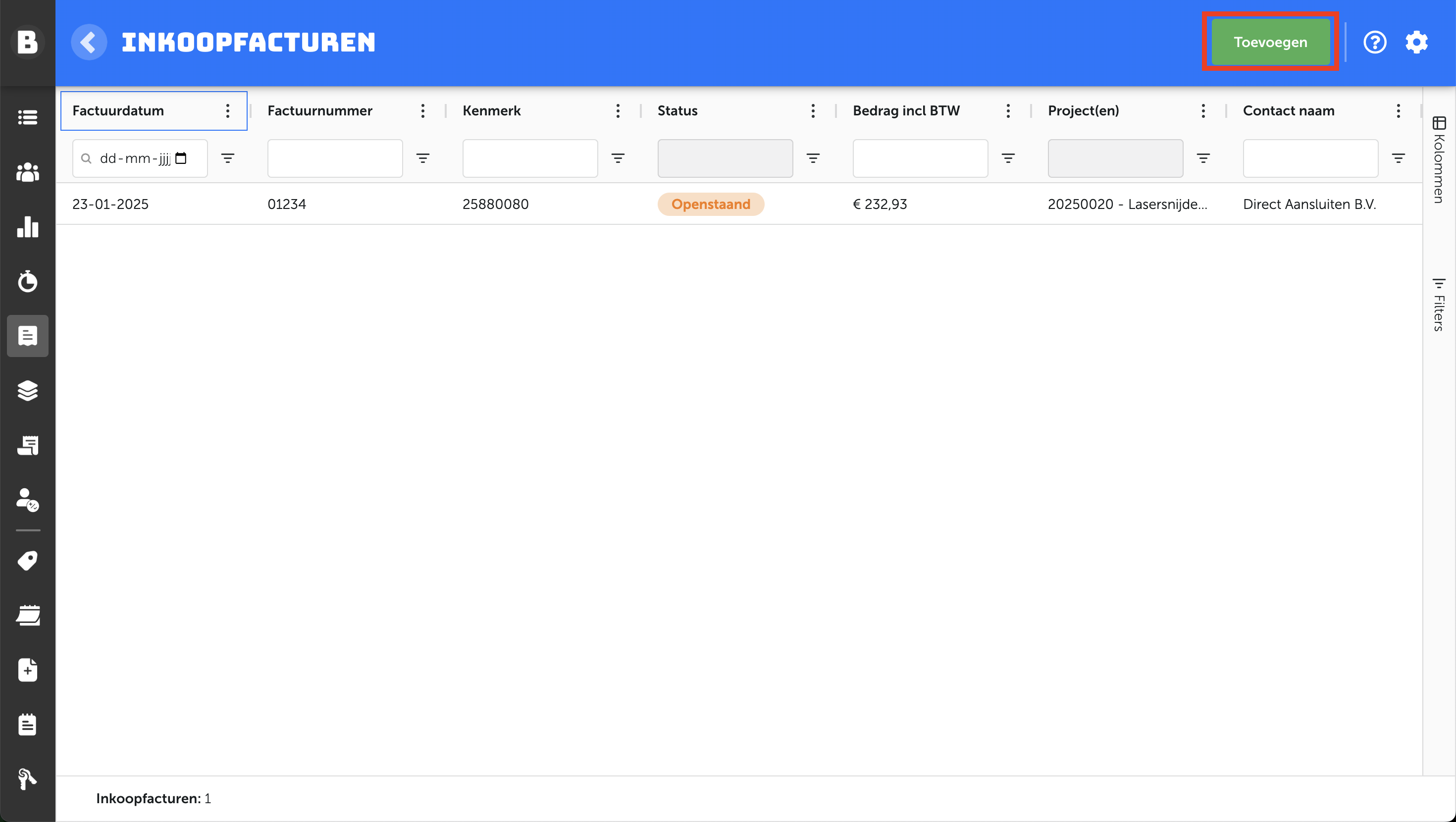 Gebruik de groene knop in de module inkoopfacturen rechtsboven in het overzicht