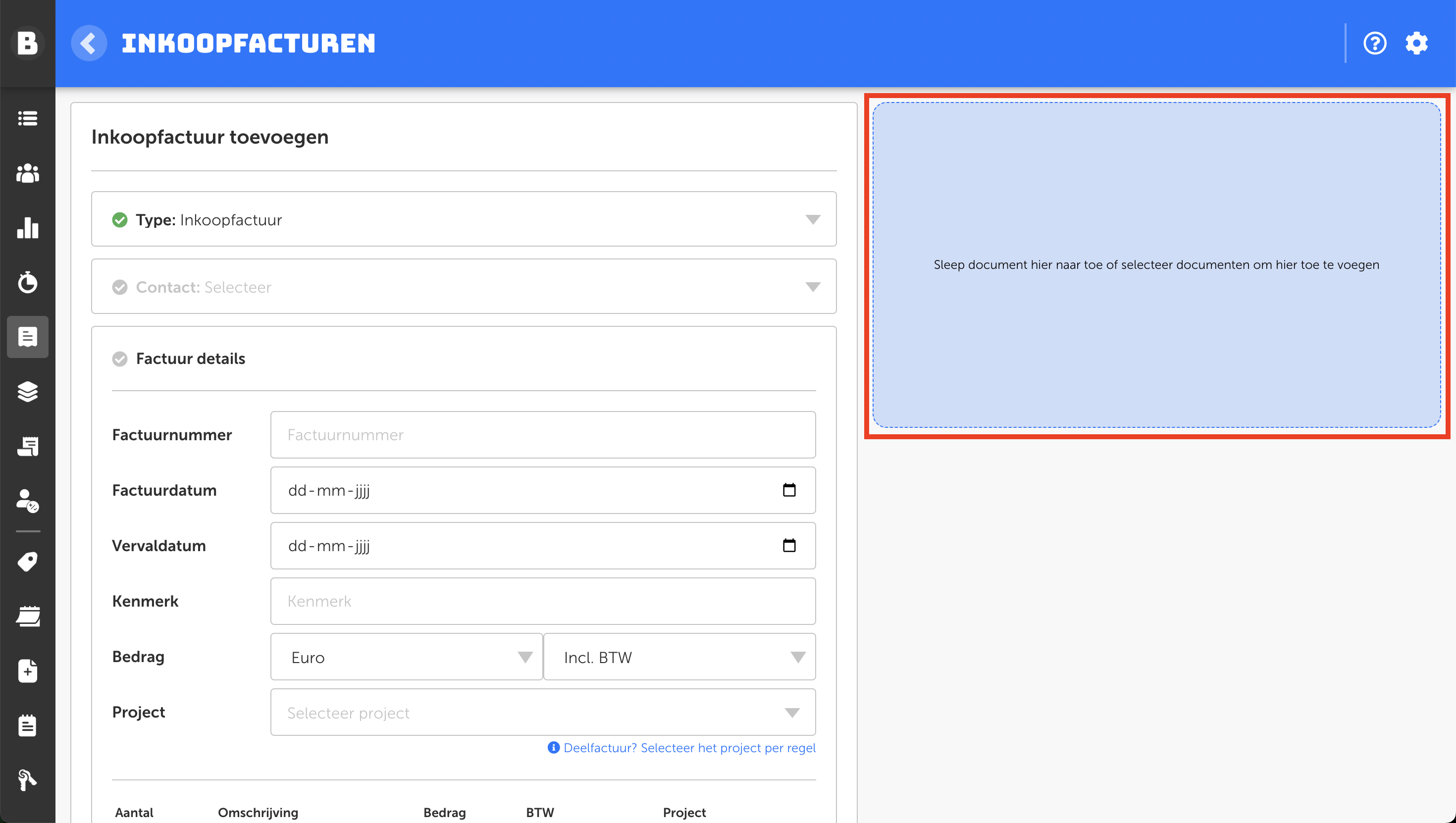 Sleep de inkoopfactuur naar het blauwe veld om je inkoopfactuur te uploaden.