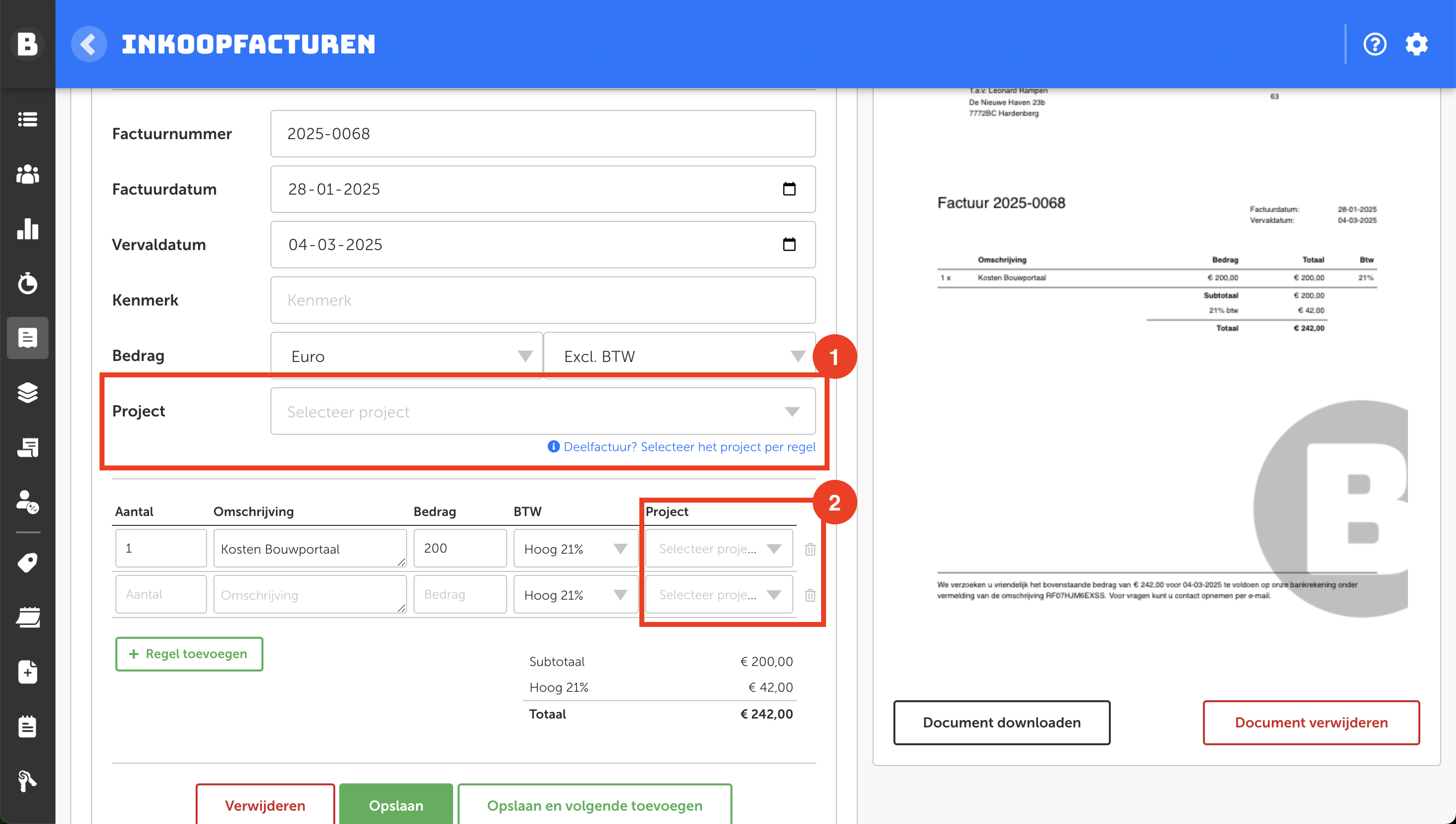 Optie 2: Is het een verzamelfactuur? Kies per regel het project bij 2 (zie onderstaande voorbeeld)