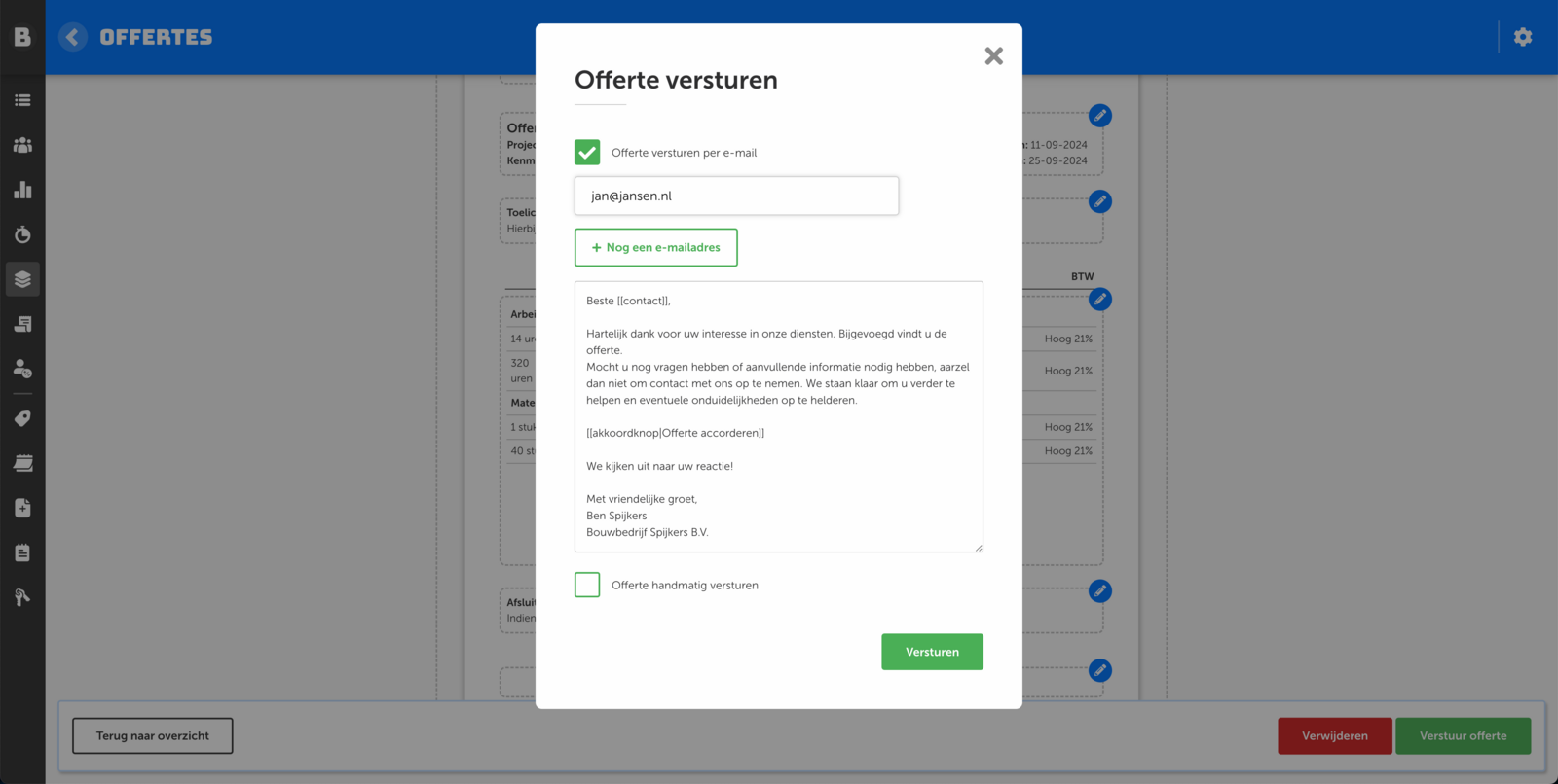 • Selecteer verstuur handmatig, voor wanneer je de offerte wilt downloaden en per post of persoonlijk wil overdragen.