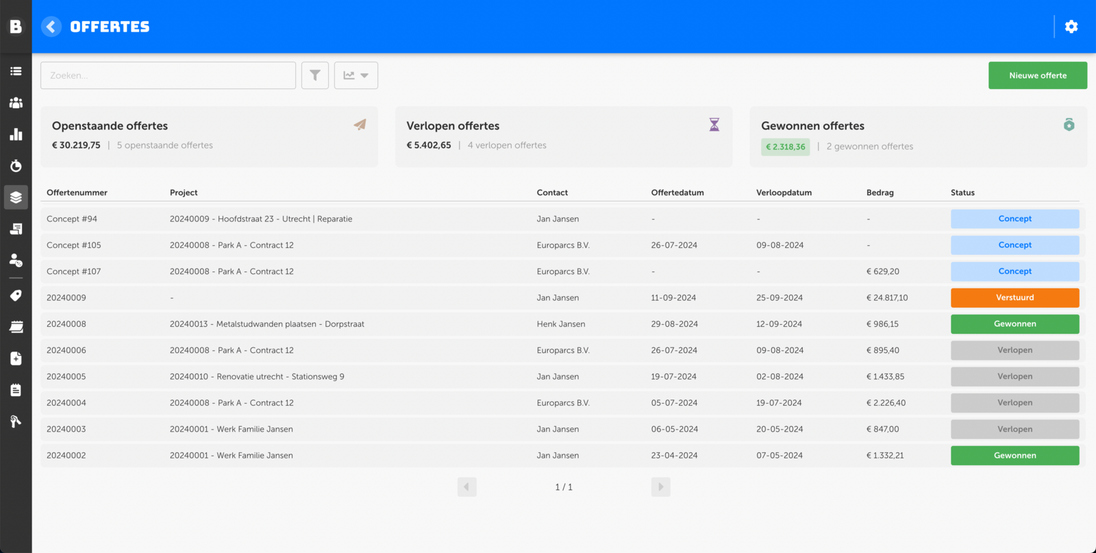 De status van de offerte is de zien in het offerte overzicht.